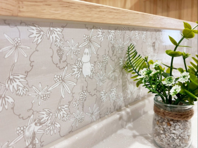 奥様こだわりのかわいいキッチンパネル。料理しながらほっこりします。