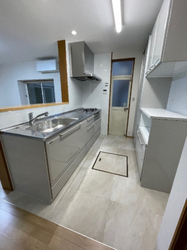 物を置くスペースが少ないため、カップボードを追加で設置し、収納力アップにつなげました。キッチンとリビングの床材を変えました。キッチンの床材には清掃性の良いフロアタイルを提案いたしました。