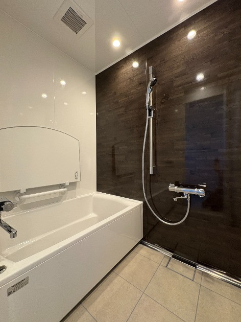 お掃除の手間を少しでも省くため、収納棚やミラーをなくし、必要最小限のものだけ取り付けしました。床は皮脂汚れも付きにくく温かい磁気タイルの床を採用させていただきました。今後の老後の生活を考えて、手すりはシャワーの部分と浴槽面に1箇所と計2箇所取り付けましたので、老後の生活でも安心してお使いいただけます。