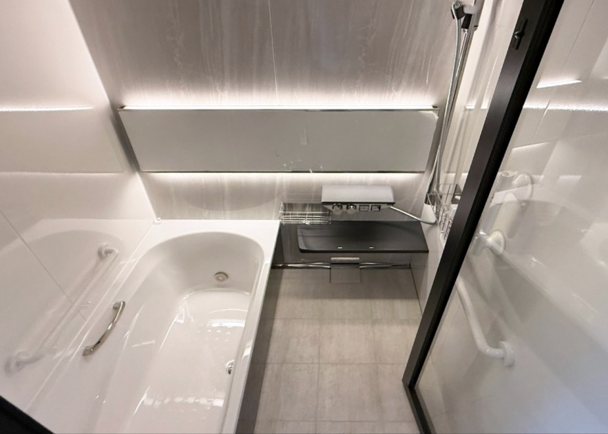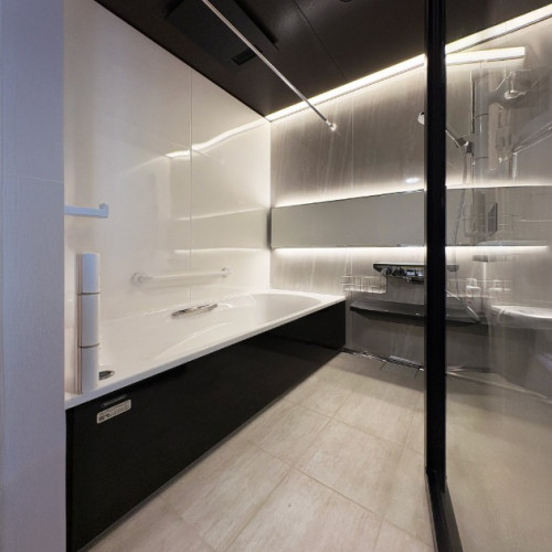 間接照明がミラーに映り込み、空間に奥行きと高級感を演出する「グランスパ」。清潔感溢れるホワイトの壁面と、モダンなブラックの収納棚が調和し、洗練されたバスルームが実現しました。お掃除しやすいホーロー素材は、日々の家事を軽減。一日の疲れを癒やす快適さと、お手入れのしやすさを両立した、まさにお客様の理想を叶える空間です。