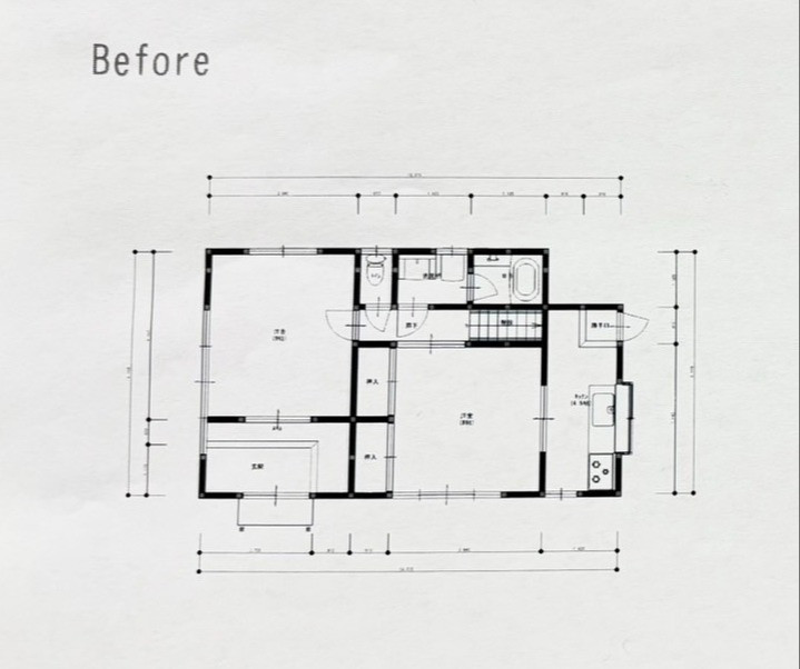 居間と台所の間仕切り、廊下からの居間、トイレ、洗面所への動線での生活であったが、間仕切りを無くし、開放感のある一体の空間を創り、家事動線をスムーズに行えるように家事効率の改善を計画した。二人暮らしになり、どこにいても、見えるという、安心生活空間設計です。