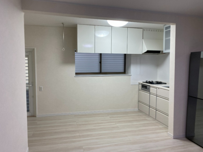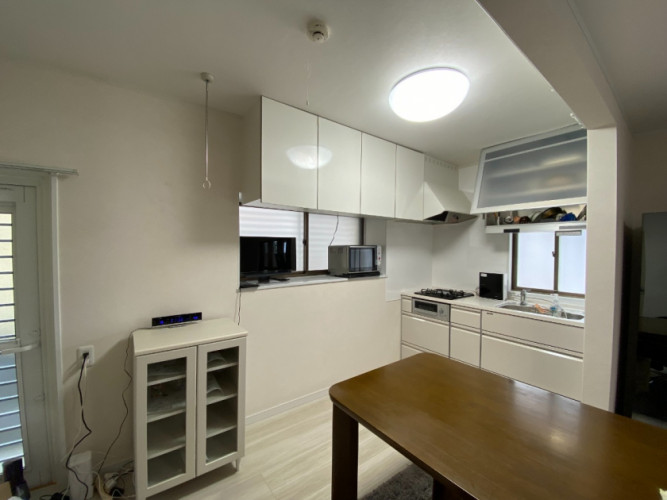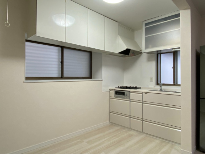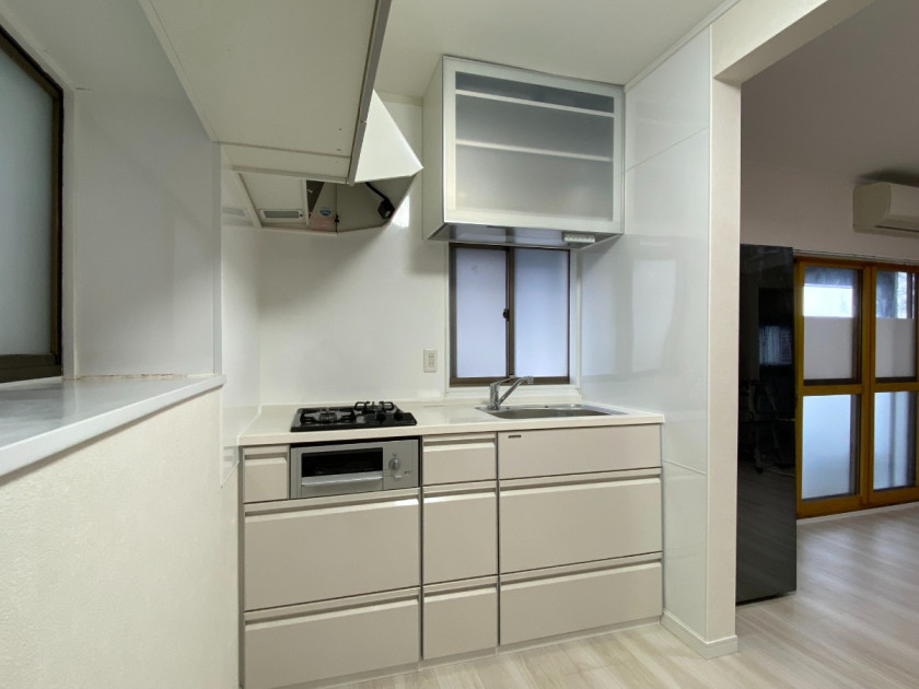 既存のスペースを利用して、キッチンを配置。これにより南の窓の採光、換気、排煙の機能を活かせる配置とした。また、コスト削減を図り、既存のレンジフードをそのまま利用できる位置にビルトインガスコンロを設置した。電動吊戸棚を設置して、広い空間を確保した。既存の小壁により、見せたくないスペースの空間創りを図った。