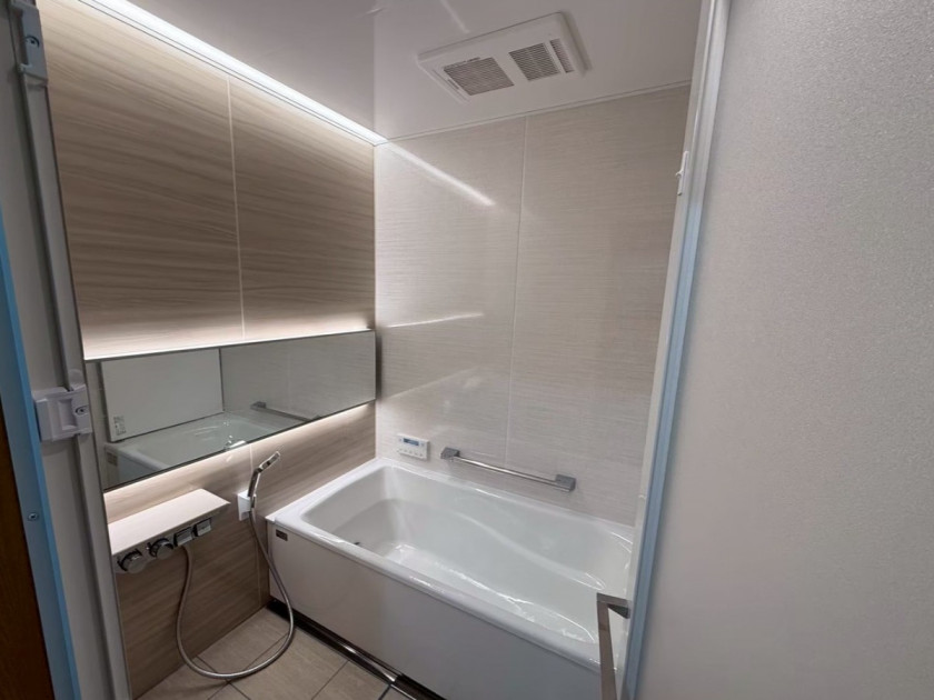 高断熱浴槽と断熱風呂に加えて浴室暖房乾燥機を取り入れ、冬場はしっかりあたたまり他の季節も乾燥や涼風の機能を使用することで一年中快適に過ごせる空間に仕上がりました。また、ラグジュアリーミラーを取り入れたことで、シーンに合わせた癒し空間を演出できるようになりました。