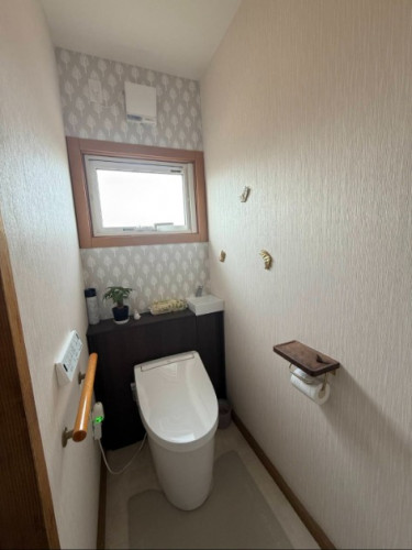 配管やタンクを隠したいというご要望があり、収納力があって掃除もしやすいキャビネット付のトイレにして見た目がスッキリ!トイレ入替に伴って一面のみデザインのあるクロスに張り替えたことでおしゃれな空間に仕上がりました。