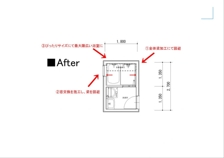 中古物件の購入を機にUBをご希望いただいておりましたので、タカラのユニットバスであれば梁加工により対応可能の為、ご提案させていただきました。