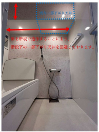 既存の浴室の階段下天井を避けるため梁を造作しております。