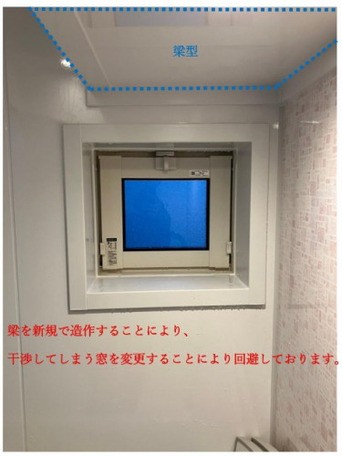 新規で梁を造作した際に窓に当たるため、窓サイズを小さくし梁を回避しました。