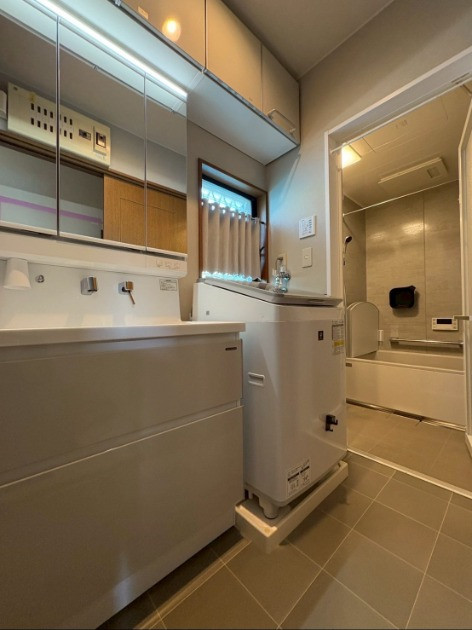 浴室のタイルと洗面室の床材を同系のデザインにすることにより、