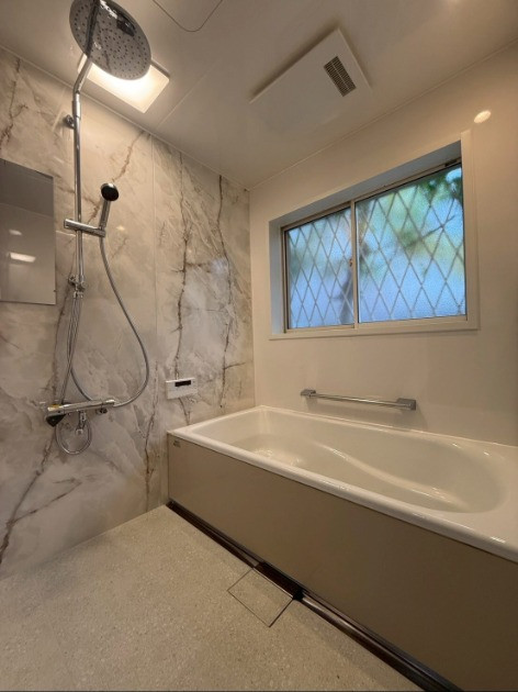 新色のホワイトオニキスをご採用いただいた高級感のある浴室空間に仕上がりました。