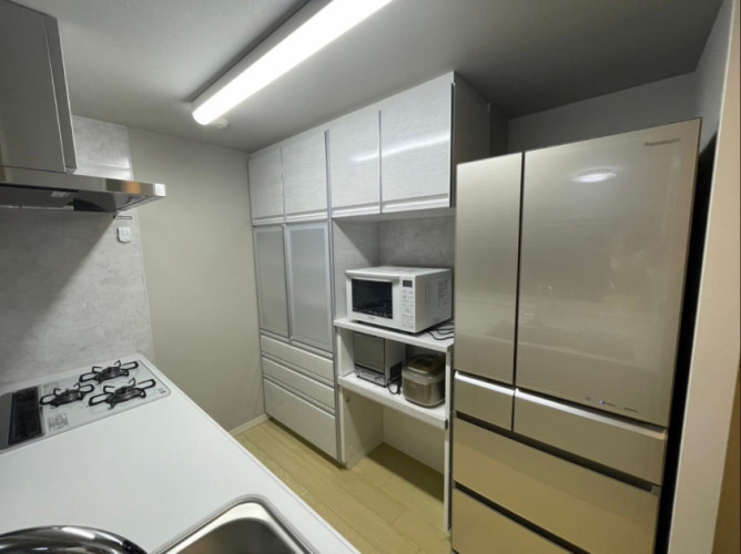 収納が足りないとお話し頂いておりましたのでカップボードの片側にトールキャビネットを採用し収納力を上げました。