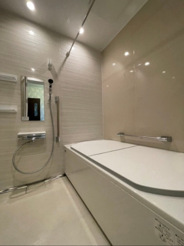 ぴったりサイズグランスパを設置しました。オーダーサイズにより出来る限り広げた浴室となりました。ベージュ系の浴室内にアクセントパネルとしてウォルナットホワイトの木目が映える浴室となりました。
