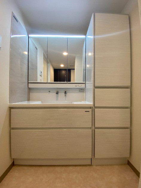 既存の洗面台は幅目一杯のタイプではありましたが、収納力を増やすためW1000サイズの洗面台とW450サイズのトールキャビネットをご採用いただきました。