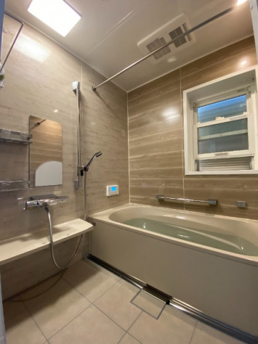 ブリックベージュ+グレージュアッシュの組み合わせにより、温かみがあり高級感のある浴室空間となりました。