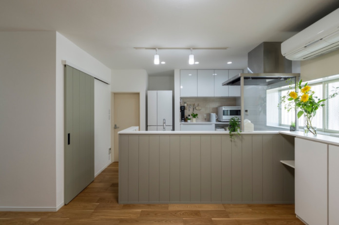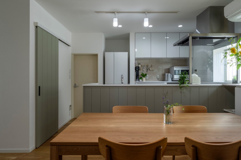 2ヶ所ある引き戸はモールディング調のグリーンの建具に交換、レミューのデザインが引き立っております。