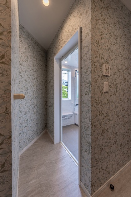 内装材はウィリアム・モリスの壁紙を使用し、床もフロアタイル貼りになり明るい空間になっております。