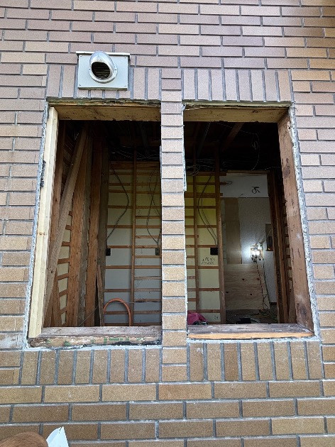 外壁がレンガタイル貼りであり外壁をカットすることが出来ないため、サッシのみを撤去して行うハツリ工法を採用しました。