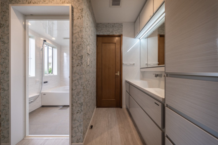 台形の不整形な部分に新たに脱衣室が生まれました。元々脱衣スペースは広くなかったため、とても喜んでいただきました。