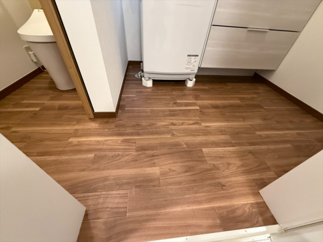 床材はリフォルタを採用水周りは通常CFシートを張ってますが更に強い塩ビタイル製です。