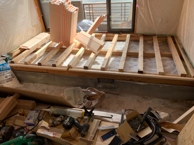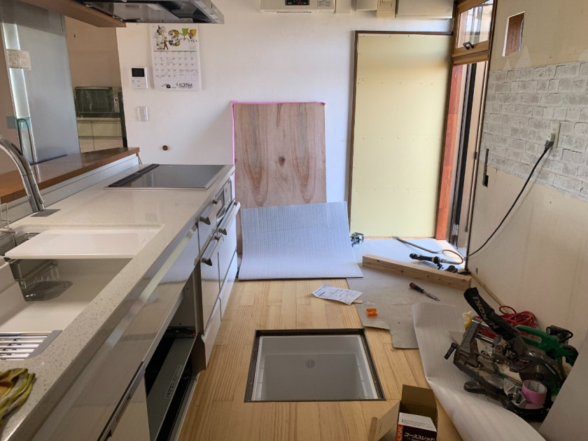 20年前にリフォームして入居した中古住宅でLDKの床に湿気で穴が空いてしまいました。当時システムキッチンも交換しましたが、足下が腐って面材が膨れていたので一緒に交換する事にしました。