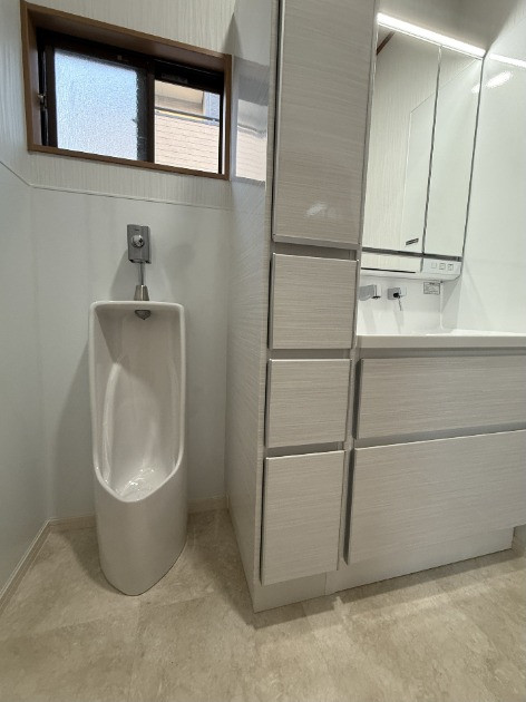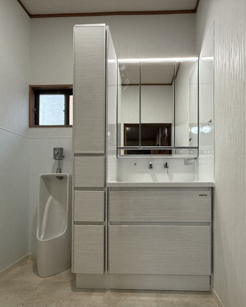 既存には小便器との境に袖壁が有り、洗面化粧台と小便器の交換に伴い撤去して広く明るく、掃除がし易く、収納力もアップする工事です。