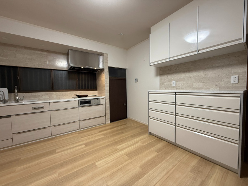 天井を撤去し構造上の問題で流しの上の天井部分は他と替える事になりましたが、すっきり収まりました。両サイドにはカップボードと家電収納と収納量はたっぷり取れました。