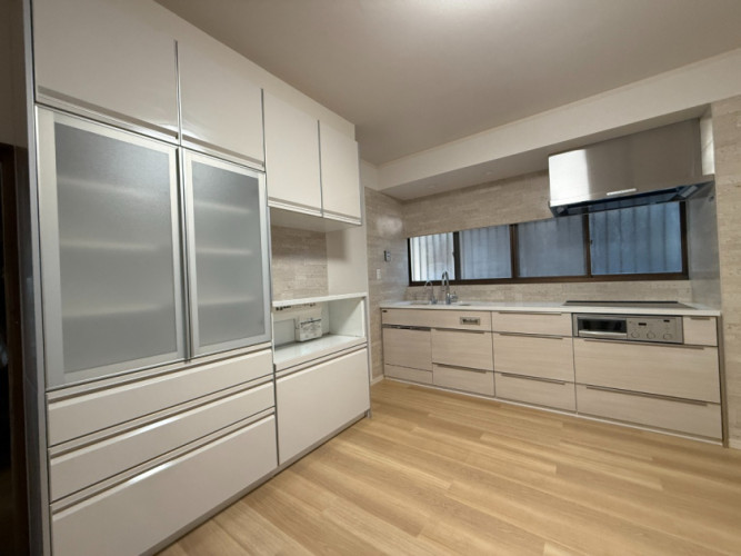 新規に家電収納をセットした、タカラ製のトレーシア、キッチンはレミュー仕様