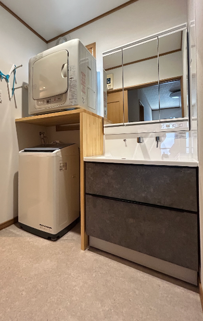 新たに採用したのは、二段引き出しタイプの洗面化粧台。奥までしっかり使える引き出し収納で、タオルや日用品の整理がしやすく、出し入れもスムーズになりました。