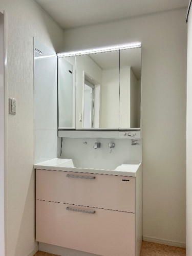 空間の印象を決める洗面台のカラーは奥様こだわりピンク色に。明るく清潔感のある空間へとなりました。