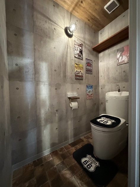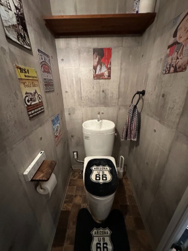 2階トイレの施工後の様子です。お父様のお部屋に新たにトイレを新設しました。コンセプトは海外のバーのような雰囲気。モダンさに加えてどこかアメリカンなテイストを取り入れ、遊び心あふれるデザインをご提案しました。遊び心一杯のデザインをご提案致しました。