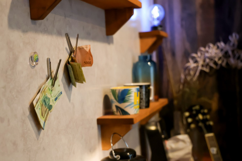 『かっこいい』だけではないのが、エマウォールの魅力です。木製棚にはお父様の思い出のマグカップが並び、手前には次回の海外旅行で使う予定の紙幣をクリップでディスプレイ。実用性と遊び心を両立できるエマウォールは、やはりデザイン性でも機能性でも一番です