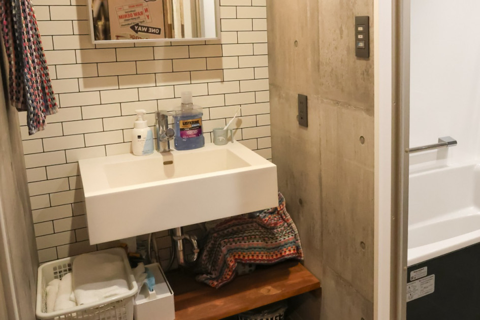 洗面台下部に木材を加工し、使い勝手のよい収納スペースを設けました。