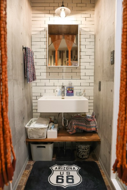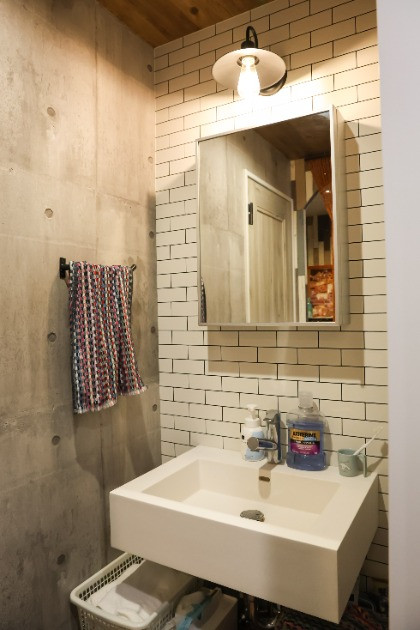側面にはモルタル調の壁紙、背面にはタイル調の壁紙を採用しました。