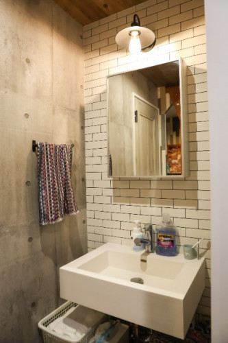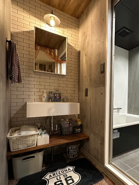 海外旅行がお好きなお父様が、宿泊先のホテルで気に入られた洗面空間をイメージし、デザインをプランニング。仕上がりに大変ご満足いただき、「理想通りのかっこいい空間になった」とお喜びいただきました。