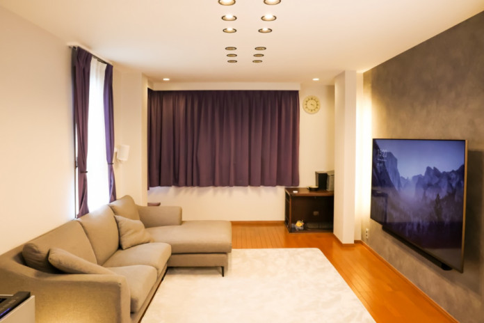 団欒スペースは壁掛けテレビ+サラウンドシステムを採用し、映画鑑賞も快適に。