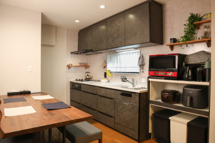 収納力に優れたレミューとカップボードを並べて設置し、無駄なスペースをなくしたことで動線が改善。家電やゴミ箱の置き場も整い、使いやすくまとまりのある空間に仕上がりました。