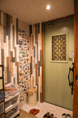 入口部分の壁紙の一部をさりげなくエマウォールに。こちらは旅の思い出に必ず購入される地名の入ったマグネットです。今までの旅行先の思い出コーナーとなりました。