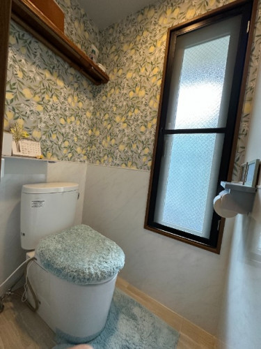 腰壁にはタカラスタンダードのトイレ用ホーローパネルを採用し、上部にはレモンの木のデザインクロスを選びました。