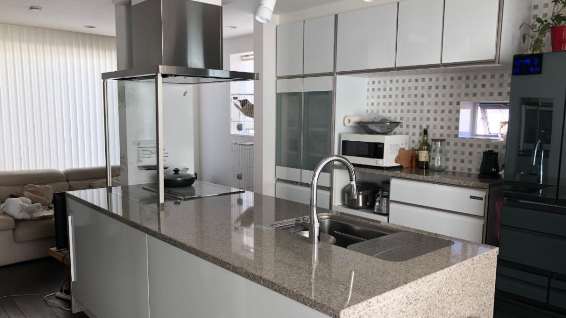 高級感のあるアイランドキッチンは明るく風通しもよくなりました。