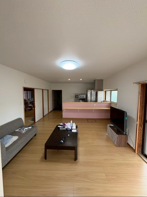 梁の補強工事を行い柱を撤去しました。広々としてLDK空間で開放感があります。