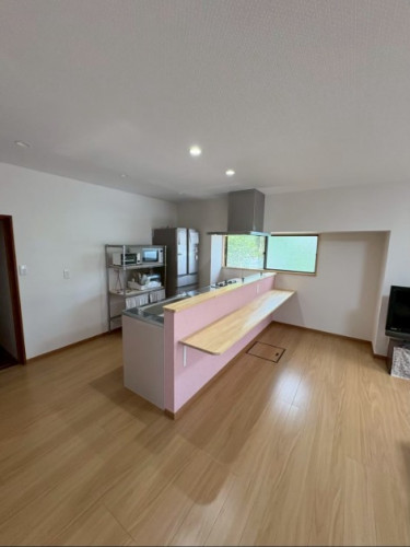 対面キッチンにするために柱の撤去と梁の補強工事を行いました。床、壁、天井に断熱材を入れて断熱性も向上しました。キッチン前の造作の対面壁に集成材カウンターを取付けました。朝ごはんを食べたり、デスクワークをするスペースに活用することが出来ます。クロスや床材も明るい色を選び、清潔感のあるLDKになりました。照明は最低限で良いとのことで少なめに配置しています。