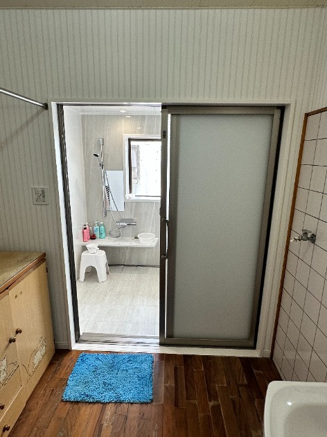 1620のシステムバスの標準ドア位置で納めるとチェストと干渉して出入りしにくそうでしたので、ドア位置変更をご提案しました。430mm移動することでチェストを避けることが出来ました。