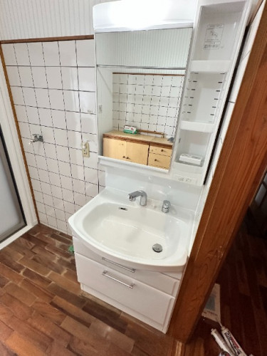 システムバスと一緒に洗面化粧台も取替のご提案をさせて頂きました。脱衣場の天井やタイルはそのままでOKとのことでしたので、システムバスの入れ替えで絡みがある壁のクロスを貼替しました。洗面化粧台オンディーヌはホーローボウル、ホーローキャビネットで耐久性と清掃性に優れている、且つお値段もお手頃で人気のシリーズです。