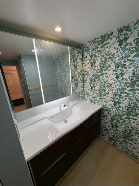 洗面台とかわいい壁紙へ交換し、一気に雰囲気が変わりました。人大のカウンター、ホローのキャビネット、間接照明で高級感もアップです。