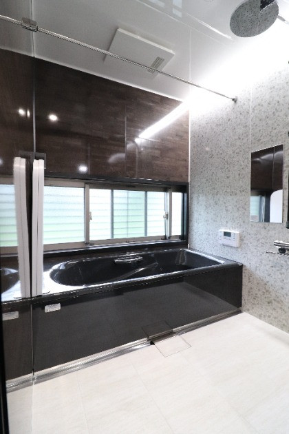 浴槽はブラックに壁も濃いブラウン系に正面はグレー石目で本当に豪華なバスルームデザインとなりました。