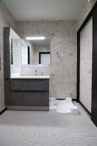 洗面所はユニットバスサイズを小さくしたことで20cm拡張されて広くなりました。洗面台を1m5cmに少し小さくすることで新たに洗濯機パンを移動取替しました。