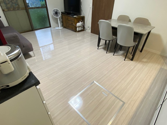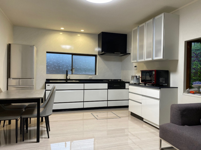 また今回採用した最高級キッチンをより引き立たせる為、鏡面大理石調フロアをご提案~全面内装クロス張り施工~キッチン手元灯にダウンライトを採用も含めガラッと雰囲気の違うキッチン空間へとリフォームさせて頂きました。
