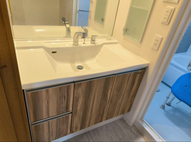 洗面のサイズを1センチ単位でオーダーすることが出来るリジャスト。既存の鏡は再利用して下台は105センチの両壁ぴったりの洗面を設置しました。掃除もしやすく価格も安く満足度が高いリフォームになりました。