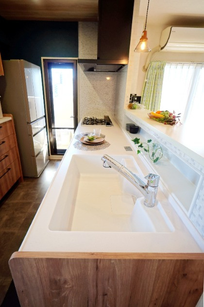 キッチンの高さは背の高い奥様が使いやすいように90cmで、シンクは、耐久性の高いアクリル人造大理石を採用。