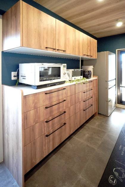 キッチンとカップボードはお揃いの扉カラーで、木目調がおしゃれなヒッコリーミディアムです。