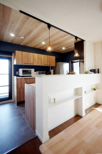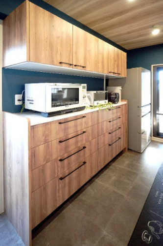 キッチンとカップボードの扉カラーは、木目調がおしゃれなヒッコリーミディアムです。この色に合わせて壁のクロスは濃いブルーに天井クロスを木目にコーディネートしました。